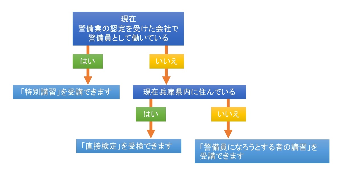 | 問い合せ・申込先 | 特別講習…(一社)兵庫県警備業協会 直接検定…兵庫県警察 警備員になろうとする者の講習…(一社)警備員特別講習事業センター |